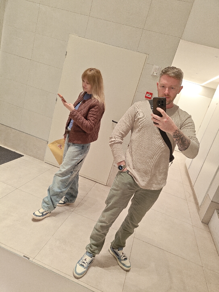 A mirror selfie captures two people in a public restroom. A man in a beige sweater and olive pants holds his phone to take the picture. He sports a watch and visible tattoos. Beside him stands a woman in a brown quilted jacket, blue jeans, and a light yellow tote bag. She holds a phone and looks at it. The restroom has a tiled floor, light-colored walls, and visible doors along the right.
