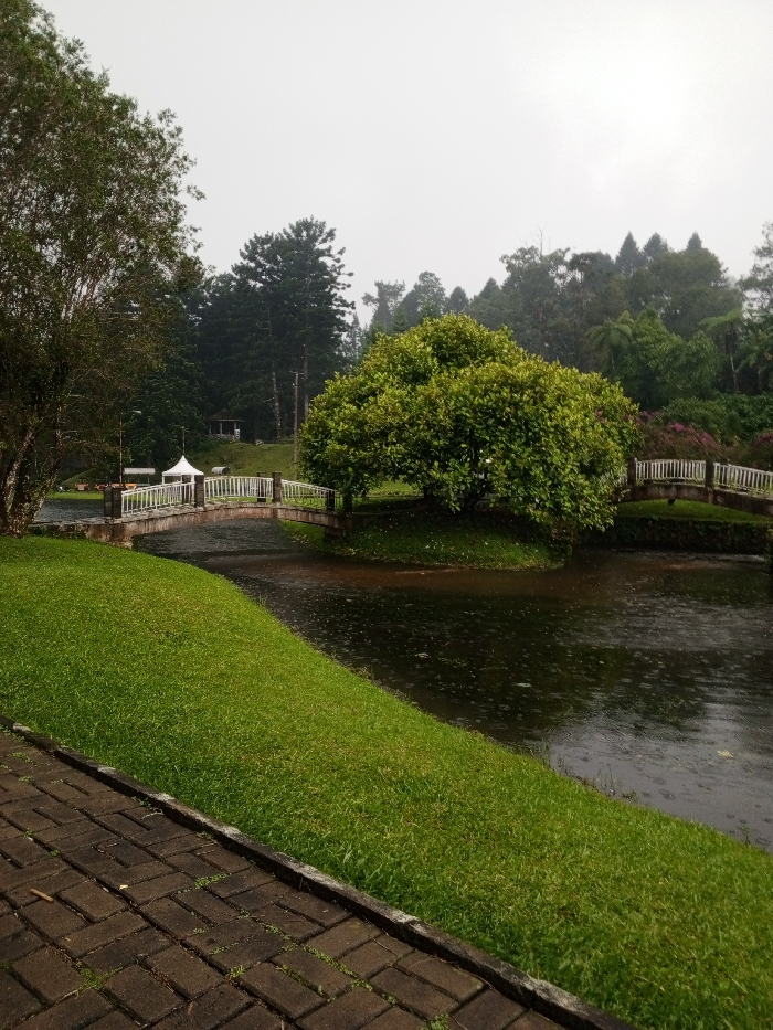 A tranquil landscape features a small island with a lush, rounded tree. Two white-railed bridges connect the island to either side of a dark, rain-dappled pond. Beyond the tree, varied greenery blankets the scene under an overcast sky. Bright green grass edges the water, transitioning into a brick walkway in the foreground. The setting evokes a sense of peacefulness.