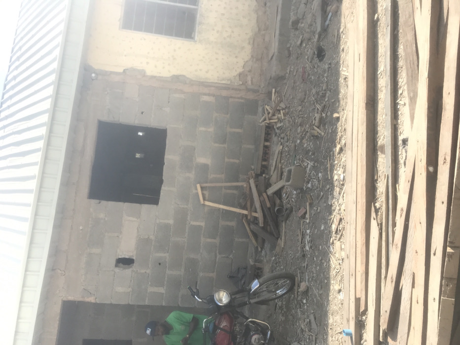 This image depicts an outdoor scene in Gwong, Nigeria, at what appears to be a construction or renovation site