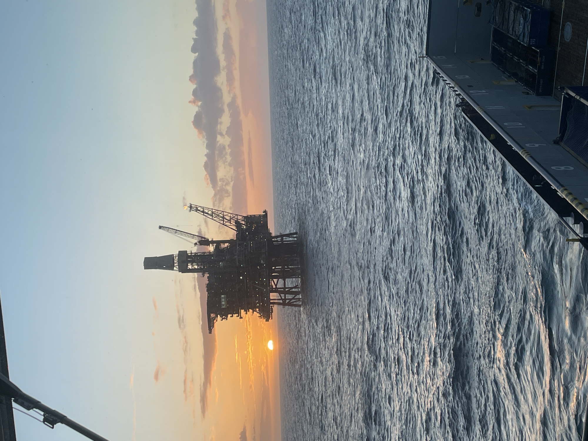 The image depicts an offshore oil drilling platform at sunset, viewed from the deck of another vessel