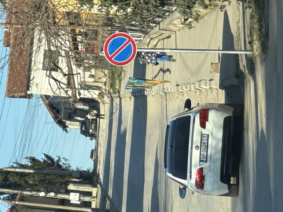 The image depicts a street scene in Knezha, Bulgaria, under a clear, bright sky. A white BMW 3 Series sedan, bearing Bulgarian license plate BP 0028 CT, is parked on the right side of an uphill asphalt road, its rear facing the viewer. The vehicle has a black panoramic sunroof and a small rear spoiler. On the right sidewalk, a standard "No Parking" sign (red circle with a blue interior and a diagonal red slash) is mounted on a pole. A child or small individual, dressed in a dark patterned jacket and blue pants, walks downhill on this sidewalk, their back to the viewer, passing behind the no-parking sign. Further down the sidewalk, a low barrier featuring blue, green, and yellow segments is visible. Higher up the ascending street, an adult individual in light-colored outerwear and dark pants is seen walking uphill on the right side of the road, carrying a light-colored object in their left hand. Behind this person, a dark-colored SUV is parked or slowly moving uphill, followed by another lighter-colored vehicle further in the distance. Residential buildings line both sides of the street. On the right, an older, multi-story building with a reddish-brown tiled roof and a light-colored facade shows signs of age. Bare tree branches from a foreground tree partially obscure the view of this building and a yellowish structure adjacent to it. On the left side of the street, utility poles and green coniferous trees are visible. Numerous overhead power lines crisscross the upper portion of the frame against the blue sky. Shadows are cast across the street and sidewalk from the sunlight.