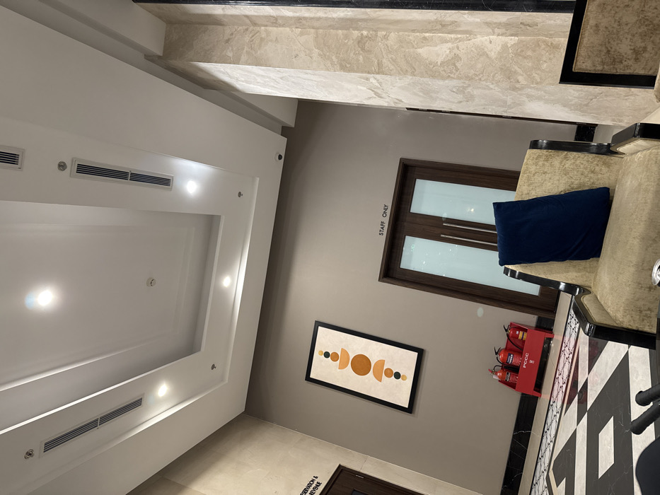 A view looking up into a brightly lit room with a white ceiling and recessed lighting. A piece of abstract art hangs on a neutral-colored wall. A doorway labeled "Staff Only" is visible. Below the doorway, a fire extinguisher sits next to a chair with a blue cushion. A black and white tiled floor is partially visible.
