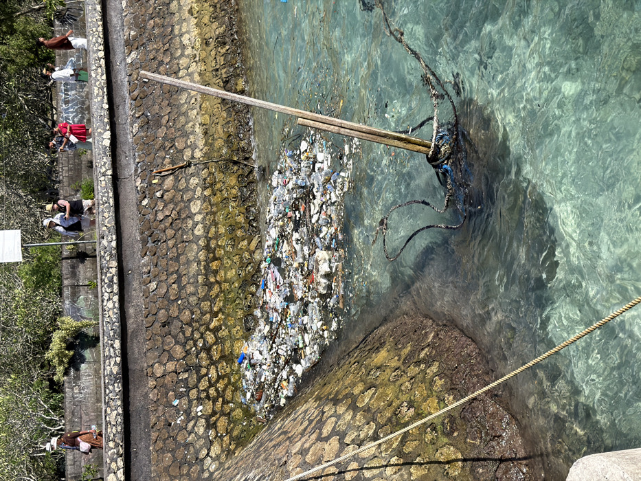 This image depicts a coastal scene in Toyapakeh, Indonesia, under clear daylight. The foreground shows a body of clear, light blue-green water with visible ripples. A thick, tan-colored rope descends diagonally from the lower left corner towards the water. In the mid-ground, a substantial accumulation of mixed refuse, primarily plastic bottles, bags, and various debris, floats densely against a stone-faced retaining wall. The retaining wall is constructed from irregular brown and dark grey stones set in concrete, extending along the water's edge and curving into the lower left. Two wooden poles, light brown in color, protrude vertically from the water near the center-right, held together by dark ropes partially submerged. Additional dark ropes extend from this structure across the water. A thin, dark, stick-like object also protrudes from the water near the retaining wall further left. Above the retaining wall, a paved pathway runs horizontally across the frame. Seven individuals are visible walking along this pathway. From left to right: one person in a long brown dress and a wide-brimmed hat, two individuals (one in a white shirt and hat, the other in a dark shirt and straw hat, possibly bending down), one person in a red shirt carrying an object, one person in a white shirt and dark pants, and one person in a dark shirt and light pants. The pathway appears to be concrete or paved, with a low concrete barrier on its water-facing side. Above the pathway, lush green vegetation, including trees and shrubs, is visible, with a white sign mounted on a pole near the center. The sky is bright and clear, suggesting sunny conditions.