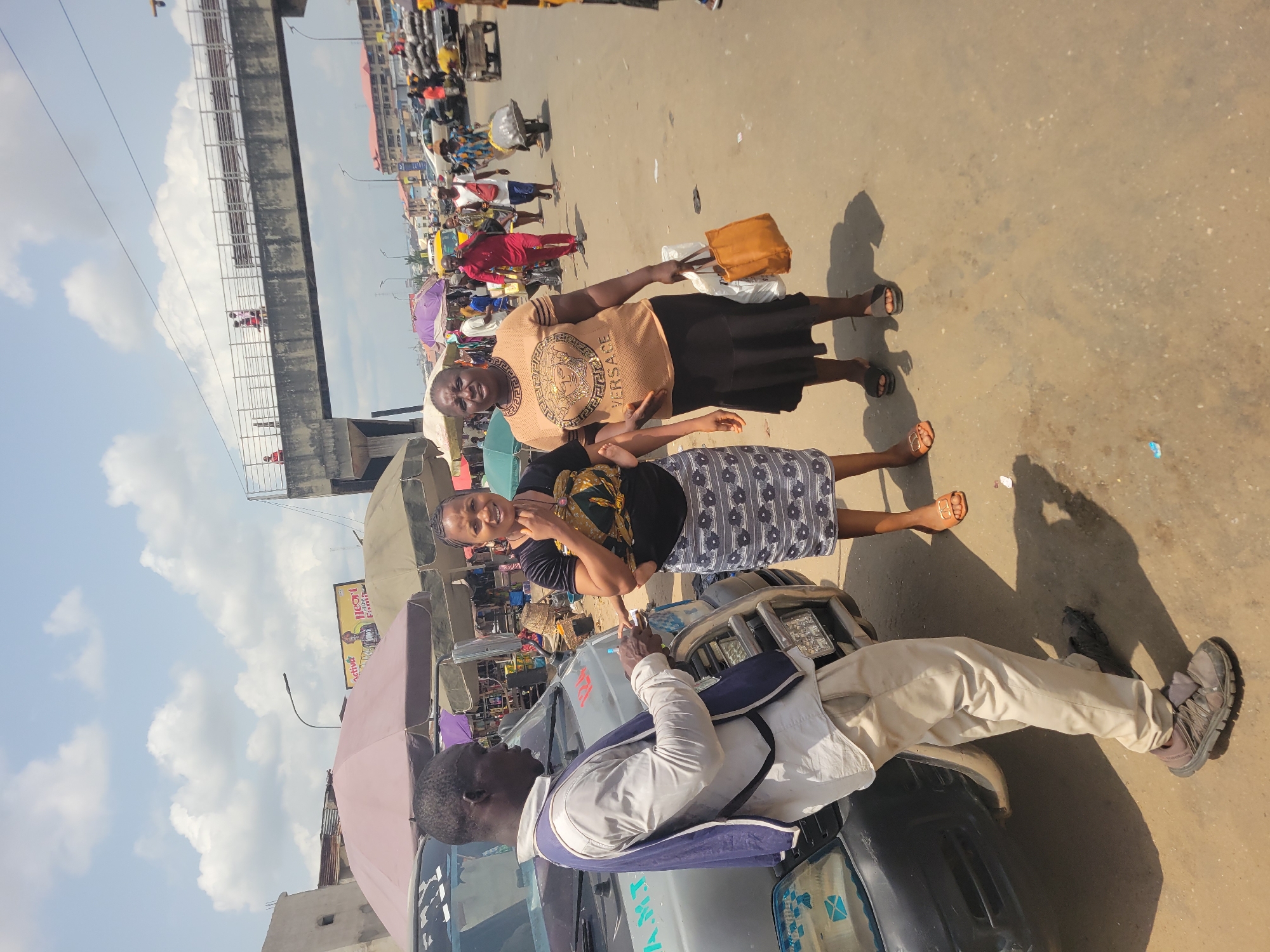 The image depicts a busy street market in Onitsha, Nigeria, under a bright sky with scattered white clouds and direct sunlight. In the foreground, three dark-skinned individuals are positioned on a paved road. On the left, a male wearing a light-colored long-sleeve shirt, a navy blue vest, and khaki pants stands beside a silver-grey minivan. The minivan features a front bull bar, the partial text "AMJ" on its hood, and "124" in red on its grille. The male holds a small, light-colored object in his right hand. Center-frame, a female wearing a black patterned short-sleeve top and a grey patterned skirt smiles towards the viewer, with a baby visibly strapped to her back. To her right, another female in a beige short-sleeve top with a prominent 'VERSACE' logo and a black midi skirt holds a brown and a white bag in her left hand, also looking towards the viewer. The mid-ground and background reveal extensive market activity. Multiple market stalls are visible, indicated by large umbrellas in colors such as light pink and olive green. Numerous pedestrians populate the street, some pushing wheelbarrows laden with goods. A concrete pedestrian bridge with metal railings spans across the street in the background, with individuals visible walking on it. Multi-story buildings and a billboard displaying the word "Active" are present beyond the market stalls. The road surface is paved, appearing worn and dusty, with shadows indicating a high sun angle.