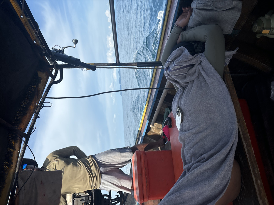 The image displays the interior of a longtail boat traversing choppy open water near Ban Ko Li Pe, Thailand, under a partly cloudy sky. Two individuals are aboard the wooden vessel. In the mid-ground, a standing male, barefoot, wears a long-sleeved olive-green shirt and grey shorts. He has blue-tinted sunglasses on and is positioned towards the stern, partially obscured by boat equipment, including what appears to be an engine. A red rectangular cooler is on the deck near his feet. In the foreground, a second individual lies prone on a wooden bench along the port side of the boat. This person is largely covered by a light grey towel, with only a portion of a long-sleeved garment and the left arm, adorned with a bracelet, visible. A silver-cased smartphone rests on the towel near their hip. Below the lying individual, a pink snorkel, dark fins, and other small items are visible on the boat's floor. The boat features a dark overhead canopy supported by metal poles. A black fishing rod with a silver reel is secured to the canopy structure on the starboard side. Multiple black wires hang from the canopy. The exterior of the boat's hull is visible along the waterline, painted yellow and blue. In the background, rolling blue ocean water with whitecaps extends to the horizon, where several distant landmasses or islands are silhouetted against the sky.