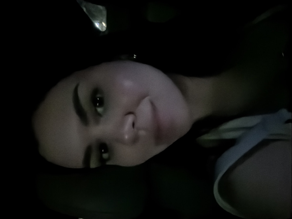 The image presents a close-up, chest-up portrait of an adult female, centrally framed. The subject has dark hair, dark eyebrows, and dark eyes, looking directly into the camera with a subtle, closed-mouth smile. Her complexion is fair, with a slight sheen on the cheeks and forehead, suggesting frontal or slightly off-center illumination. A light-colored, likely white, strap from a garment is visible over her left shoulder. The background is predominantly dark, indicative of a low-light environment. On the left side, a dark, textured surface, consistent with a vehicle's interior upholstery, is discernible. On the right, a small, bright, reflective anomaly is visible against the dark background. The scene suggests a selfie taken inside a vehicle or a confined, dimly lit space. The specific location within the city of Veracruz, Mexico, cannot be determined from the visual evidence provided.