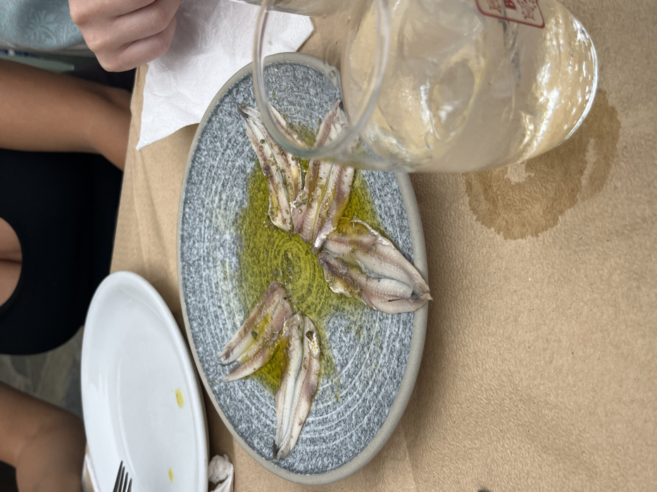 The image depicts a dining table scene in Skala, Greece. A grey-patterned ceramic plate centrally displays approximately eight whole, marinated anchovies (likely "gavros" or small sardines) arranged radially in a pool of olive oil, seasoned with visible green herbs. To the left, a white ceramic plate is present, containing a silver fork and two small, distinct drops of olive oil. In the foreground on the right, a clear glass filled with ice and a transparent liquid, possibly water or a spirit, rests on the table, creating a wet ring mark. A faint red graphic is discernible on the glass's lower right side. The table is covered with a brown, textured paper tablecloth. Portions of two individuals are visible: the upper chest and arm of a person wearing a black garment are seen behind the white plate, and the forearm and hand of another person, holding a crumpled white paper napkin, are present on the right side of the frame.