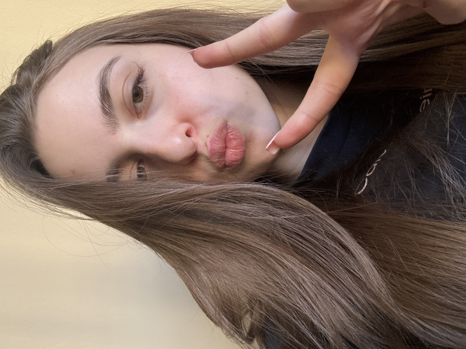 A female subject with long, light brown hair, appearing to be in an indoor setting, is captured in a close-up, chest-up orientation. Her hair is parted on the right side of her head, cascading down her left shoulder and partially obscuring the left side of her face. She has brown eyes, raised eyebrows, and her lips are pursed in a "pouting" or "kiss" gesture. The subject's right hand is raised, with the index and middle fingers extended in a "peace" sign (V-sign); her fingernails feature a light base with white tips. She is wearing a dark-colored garment, possibly a t-shirt or sweatshirt, with a faint, light-colored design visible on the left chest area. The background consists of a plain, light beige or yellow wall. The specific location within the city of Sofia, Bulgaria, is not discernable from the visual information provided in the image.