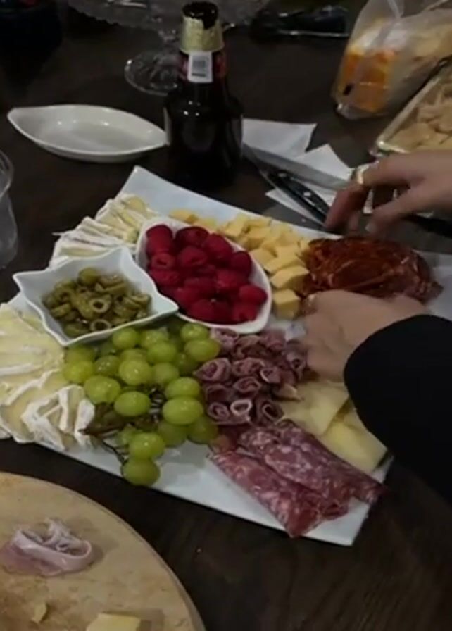 platter of food, including brie cheese, raspberries, cubed cheese, chorizo, green grapes, salami, sliced cheese, and olives. A person wearing a black shirt is seen reaching towards the platter with a knife. A beer bottle is visible in the background, as are other food items, like a container with orange slices. The platter is on a dark-colored table.
