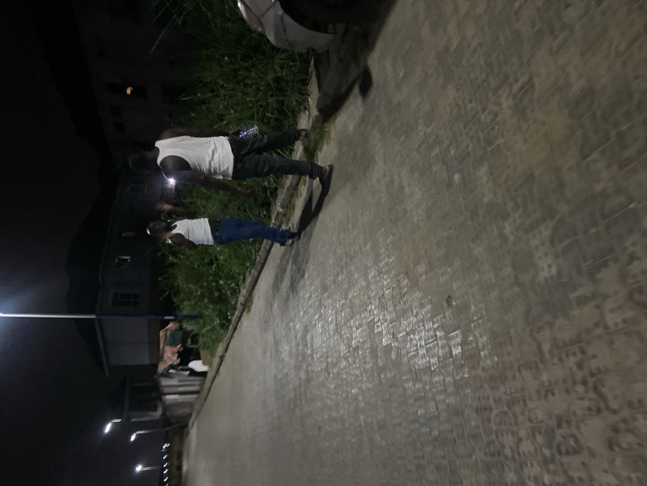 The image presents a nighttime scene on a paved street in Yenegoa, Nigeria. Two adult males are the primary subjects on the interlocking concrete paver roadway. The man on the left wears a white tank top and blue jeans; he faces slightly right, with both hands raised, palms open, appearing to be in mid-gesture. The man on the right, positioned closer to the camera, wears a white tank top and dark trousers, with his back partially turned; he holds a clear plastic bottle in his left hand. The street is illuminated by multiple tall streetlights, casting shadows and reflections on the damp-appearing paved surface. To the left of the men, the road continues into the distance, bordered by a curb and dense, overgrown green vegetation. In the background, behind the vegetation, a multi-story building with a dark roof is visible, along with a smaller, makeshift structure featuring a brown tarp roof. A portion of a light-colored vehicle is discernible on the far right edge of the frame. The sky is uniformly dark, indicating a nocturnal setting.
