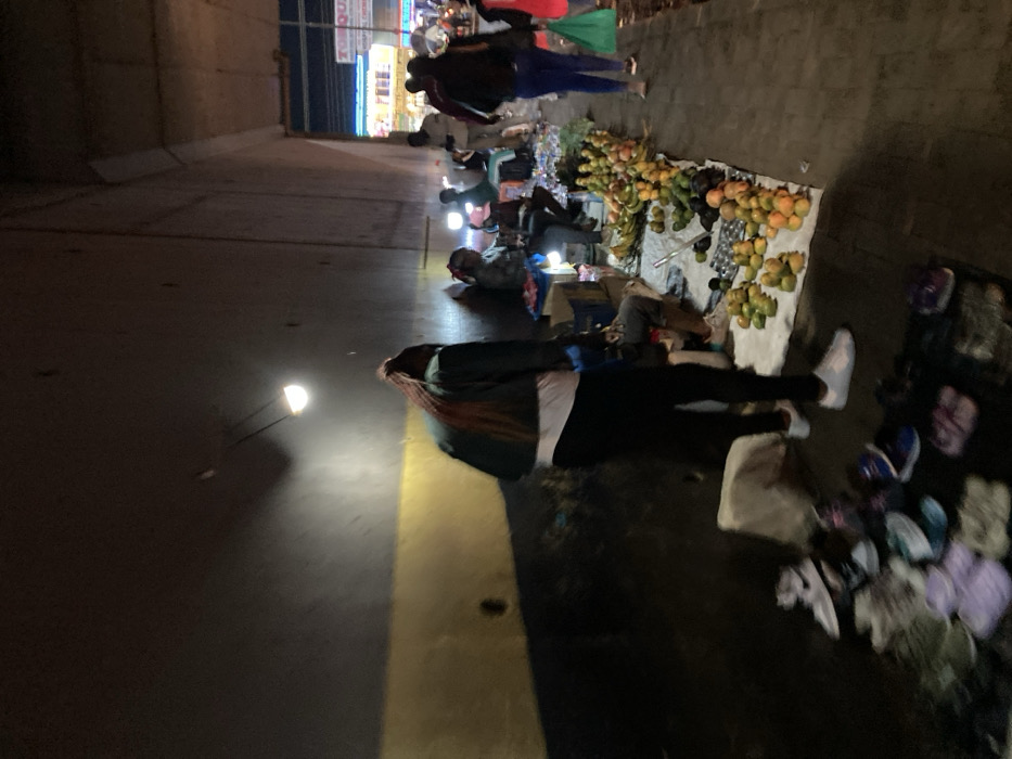 A dimly lit street scene shows several vendors with their goods displayed on the ground or tables. Fruits like mangoes and bananas are visible. One vendor lies on the ground, next to a pile of clothes. Customers are seen browsing. A streetlight illuminates a section of the road, while shops with bright signage are visible in the background. The perspective is from a slightly elevated position, looking down at the scene.