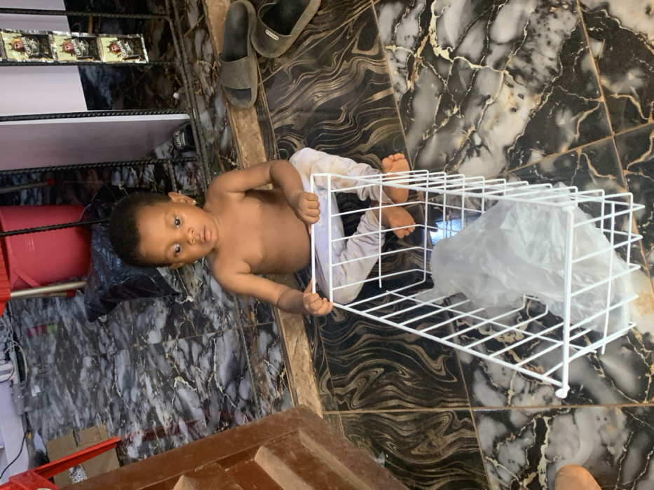 - "In an indoor setting within Aguleri, Nigeria, a bare-chested toddler with dark skin and short dark hair sits directly on a dark, marble-patterned tiled floor" by FM-axXTn1, licensed under CC BY 4.0