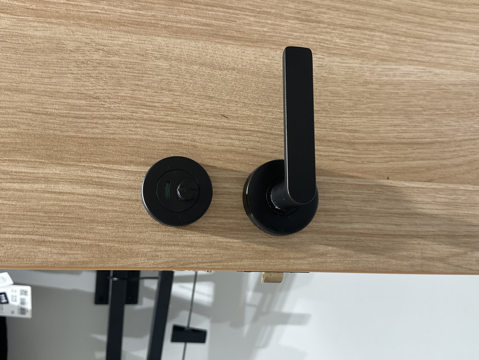 The image displays a close-up, angled view of a light-colored wooden door, likely situated within an interior commercial space in Fitzroy, Australia. The door is equipped with black modern hardware: a cylindrical privacy lock mechanism positioned above a horizontal lever-style door handle. The lock features a central slot for an emergency release or key, surrounded by a faint green indicator, suggesting an unlocked status. To the left of the door, partially out of focus, a white wall is visible behind a series of black metal fixtures, consistent with clothing racks or retail display units. A small white label or price tag with dark text is discernible at the top left, attached to one of the black fixtures. No individuals are present.