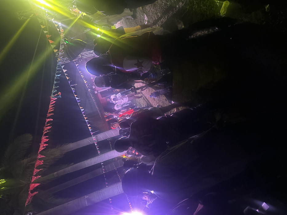 A concert with stage lighting is visible at night. A crowd of people is gathered to watch the performance. Pennant banners are strung across the top of the frame. The lights are shining brightly, illuminating the stage and some of the audience. The photograph is slightly tilted, giving it an unusual perspective. It is unclear what type of performance is taking place, but the event seems to be well-attended.