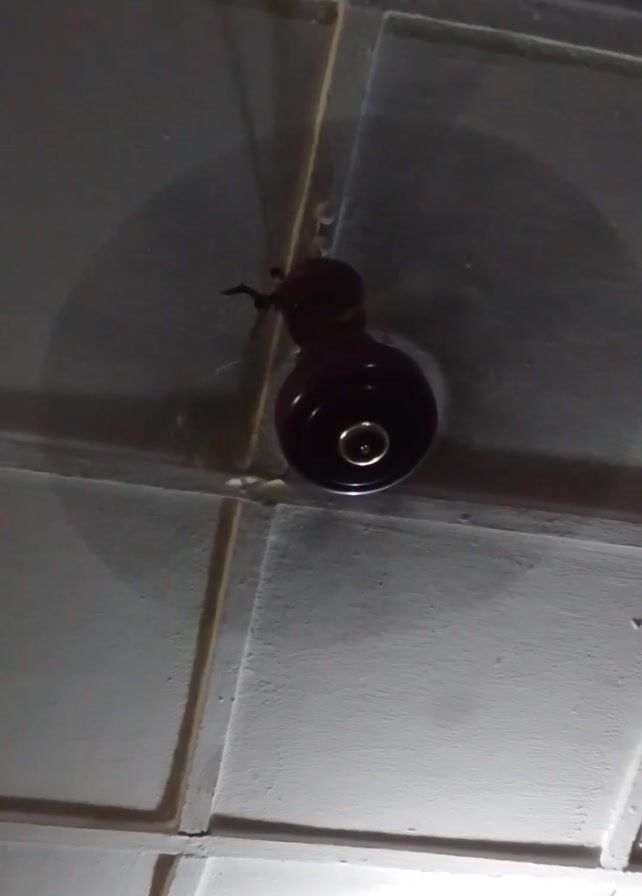 A dimly lit, low-angle shot shows a dark-colored ceiling fan mounted on a textured, grid-like ceiling. The fan is not in motion and appears to be made of metal. The lighting is poor, casting shadows on the ceiling and making details difficult to discern. The ceiling is light gray, and the fan's base is circular with a noticeable ring or opening in the center. No people are visible in the frame.