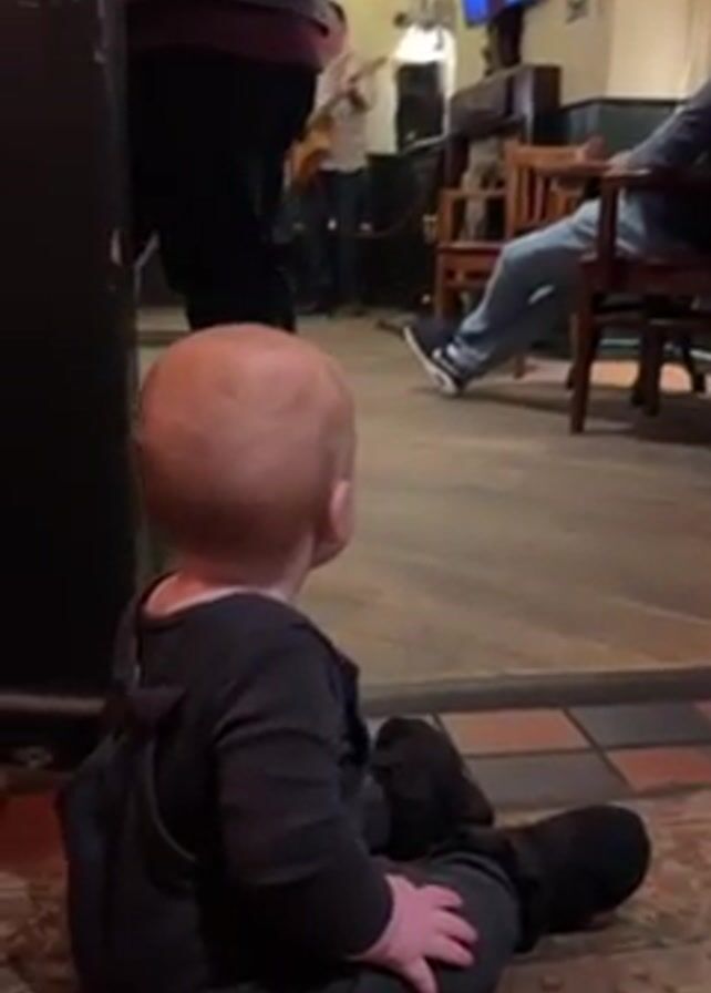 A baby sits on the floor of a bar, facing away from the camera, watching a man play guitar