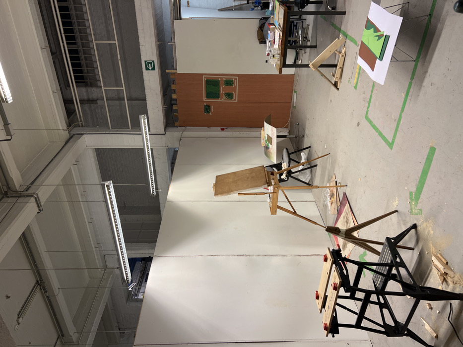 An art studio features an easel facing a white wall. A wooden backdrop with green-painted squares stands nearby. A worktable holds art supplies. A black workbench is positioned in the foreground. The floor has green tape markings. The studio's ceiling reveals industrial lighting and beams, enhancing the space's functional and raw aesthetic. A ladder cage is visible above a doorway in the top left corner.