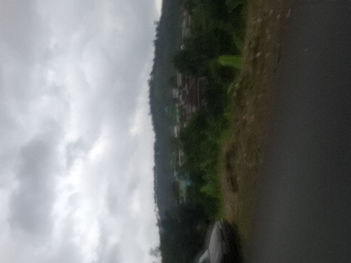 Overcast sky dominates, transitioning to a verdant hillside with buildings nestled among trees. The landscape suggests a settlement perched on an incline. A paved road, slightly blurred, occupies the foreground, implying the image was taken from it. The day appears gloomy and damp.