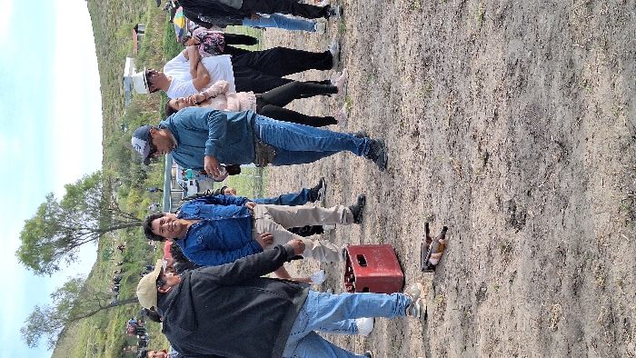 The scene is outdoors, on a dirt field, possibly a park or recreation area, located in Sabandía, Peru (latitude: -16.448, longitude: -71.474). It is a sunny day, with a few clouds in the sky. The ground is covered with sparse grass and dirt. There are six people present, three men and three women, all adults. Five of the people are in the foreground, while the sixth is further back. Three men, standing in a group, are interacting with each other. One of the men is holding a beer bottle. All three men are wearing jeans. Two of them are wearing hats. One of the men is wearing a blue jacket. The other two men are wearing light-colored shirts and are not wearing hats. One of the men is holding a brown box containing beer bottles. Two women are standing behind the men, talking amongst themselves. One of the women is wearing a white shirt, and the other is wearing a blue and white shirt. One woman is wearing a white hat. Both women are wearing jeans. A white van is parked in the background to the left. In the distance, a small group of people are standing behind the van, and there are hills in the background. There are several beer bottles on the ground, and one of the bottles appears to be broken. The scene appears to be a social gathering.
