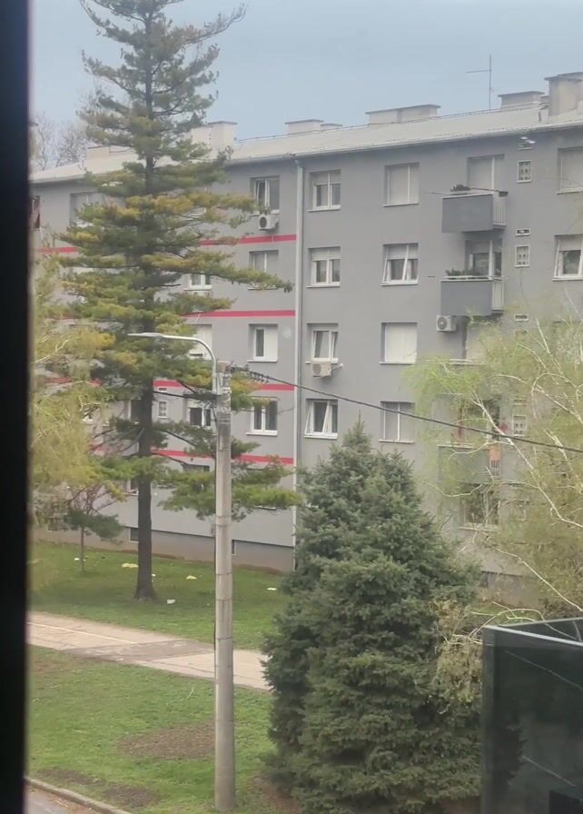 From an elevated position, likely a window, the camera surveys a street scene on an overcast day. A gray building with white-framed windows, some equipped with air conditioning units, and red stripes running horizontally adorns the landscape. Several trees, including both evergreen and deciduous varieties, populate a grassy area between the building and the street. A black car drives along the street, and a tall, gray industrial chimney rises in the distance. The general atmosphere is one of urban tranquility under a muted sky.