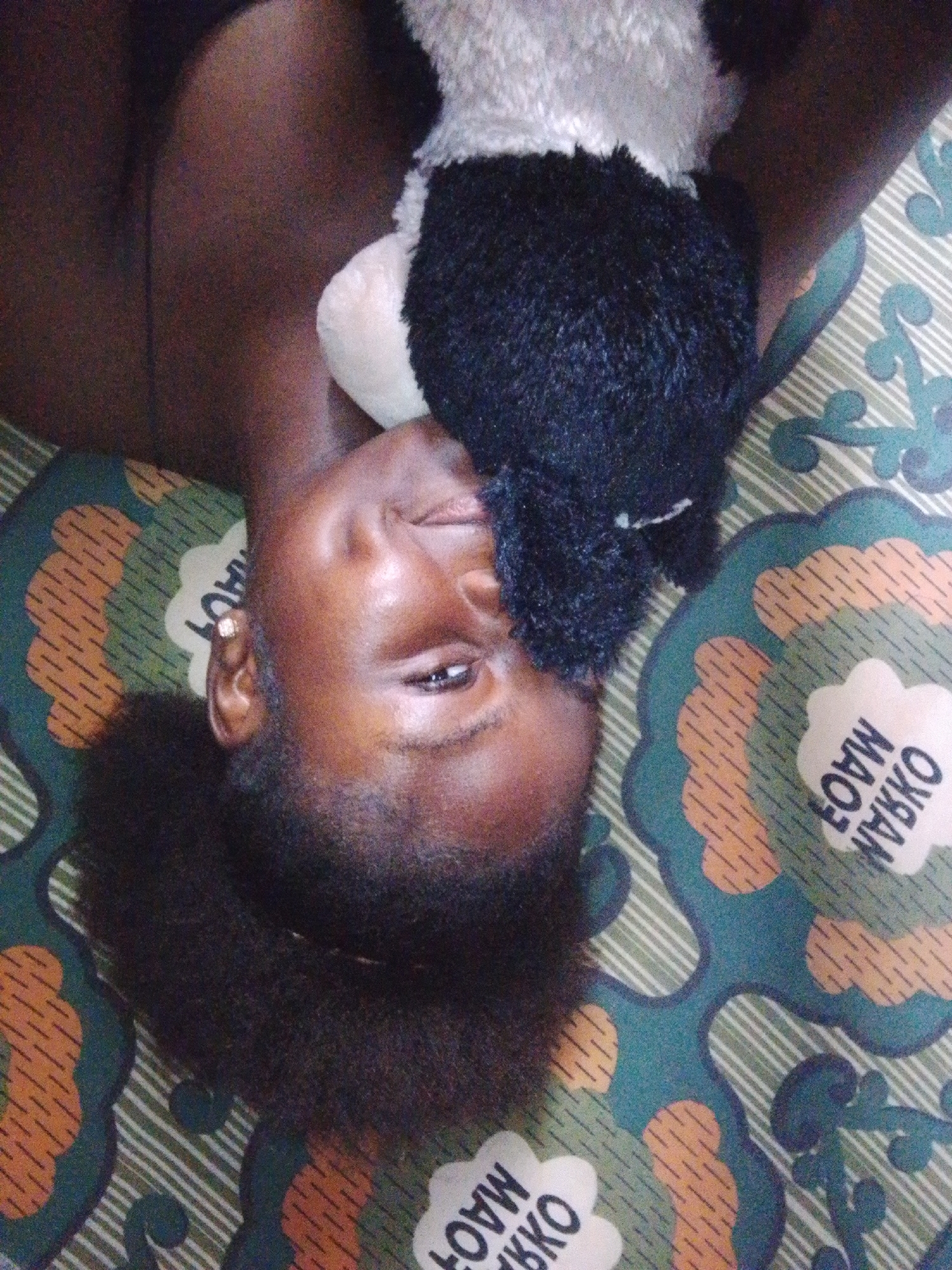 An overhead photograph depicts a dark-skinned individual, likely a female, lying supine on a patterned textile surface. The image is vertically inverted, presenting the individual's head towards the bottom of the frame. The person has dark, curly hair and a visible small, shiny stud earring in the left earlobe. Their eyes are partially closed, and their mouth forms an upward curve consistent with a smile. A black and white plush toy, with shaggy black and soft white fur, rests on the individual's chest and partially covers the lower portion of their face. The individual's upper torso and arms, dressed in dark fabric, are visible in the upper part of the frame. The background surface displays a repeating pattern featuring light green and white diagonal stripes, interspersed with organic shapes in greenish-blue and tan/orange. White, cloud-shaped motifs containing the dark text "OKRAAN MAO7" are also visible within the pattern. The lighting is diffuse and consistent with an indoor setting. This scene is located in Nsukka, Nigeria.