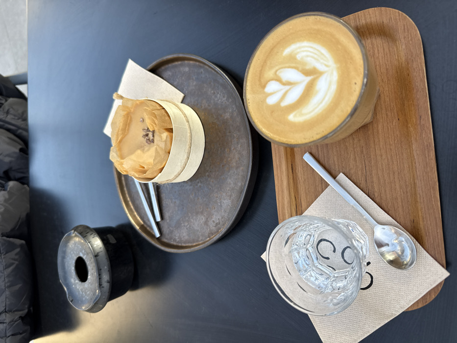The image displays a table setting in a cafe located in Andorra la Vella, Andorra. A dark, smooth table surface serves as the base for the arrangement. In the foreground, a light brown wooden tray holds a faceted clear glass containing water, positioned on a beige paper napkin. A silver spoon with a rectangular handle rests on the napkin next to the water glass. To the right, a clear glass contains a latte with a meticulously crafted white latte art pattern depicting multiple leaves. In the midground, a dark, circular, distressed metal tray features a light-colored cylindrical container, possibly made of bark, secured with twine. Inside this container, a light-colored dessert, wrapped in crumpled beige paper, is topped with several small, dark, granular pieces. Two small, silver, rectangular utensils are placed on the metal tray beside the dessert. In the upper-left background, a dark, textured ceramic ashtray with a central opening is visible. The top portion of a dark, possibly puffy, jacket occupies the top edge of the frame, indicating the presence of a seated individual. Natural light illuminates the scene from the right.