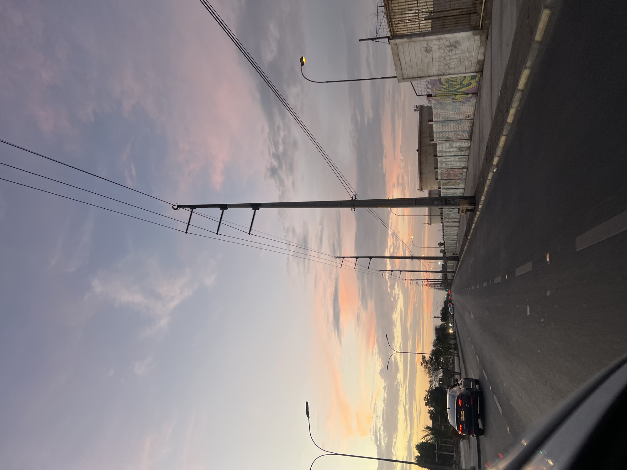 Arica, Chile: A road runs along an exterior wall. A car drives along the road. The sky is visible with a sunset coloring. Overhead power lines are visible. Street lights are visible. The photo was most likely taken from inside a moving car.