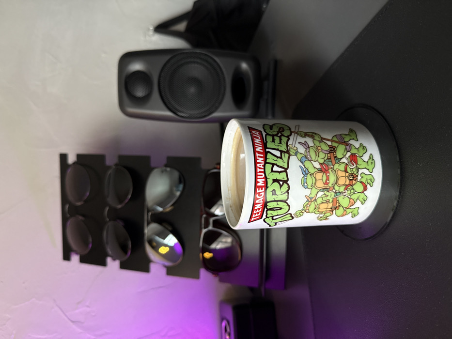 A white ceramic mug, featuring the "TEENAGE MUTANT NINJA TURTLES" logo and characters, holds a light brown liquid and is positioned in the foreground on a black circular coaster. The scene depicts an indoor setting in Moscow, Russia, likely a personal workspace. Behind the mug, to the left, a black tiered stand displays four pairs of sunglasses; from top to bottom, two pairs have dark oval lenses, one pair consists of silver-framed mirrored aviator lenses, and the bottom pair has dark lenses partially obscured. A subtle purple light source illuminates the lower left background. To the right of the sunglasses stand, a dark gray, two-way desktop speaker is visible. The background wall is a textured, light gray surface, with a black object, possibly a bag or strap, hanging from a hook on the far right. No people are present, and all objects are static.