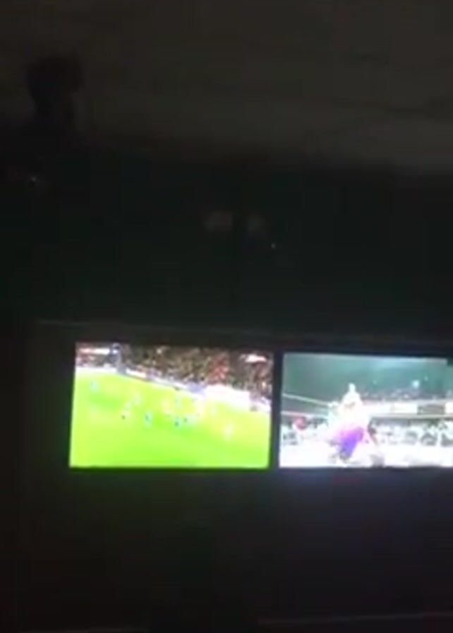 two adjacent TVs, one displaying a soccer match, the other showing professional wrestling