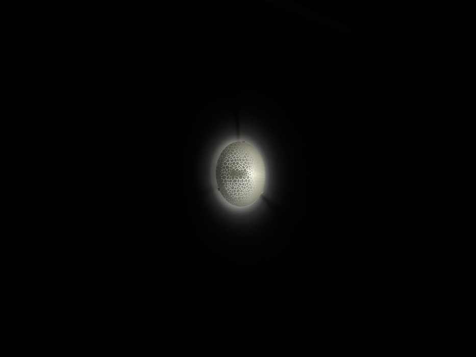 A solitary, illuminated, circular light fixture is centered within an entirely dark environment in Mokrishte, Bulgaria. The fixture's white surface features a distinct tessellated or cracked-ice pattern, emitting a soft, diffused light and a visible halo. The surrounding area is uniformly black, rendering any other objects, individuals, or architectural elements indiscernible. No actions or interactions are depicted.