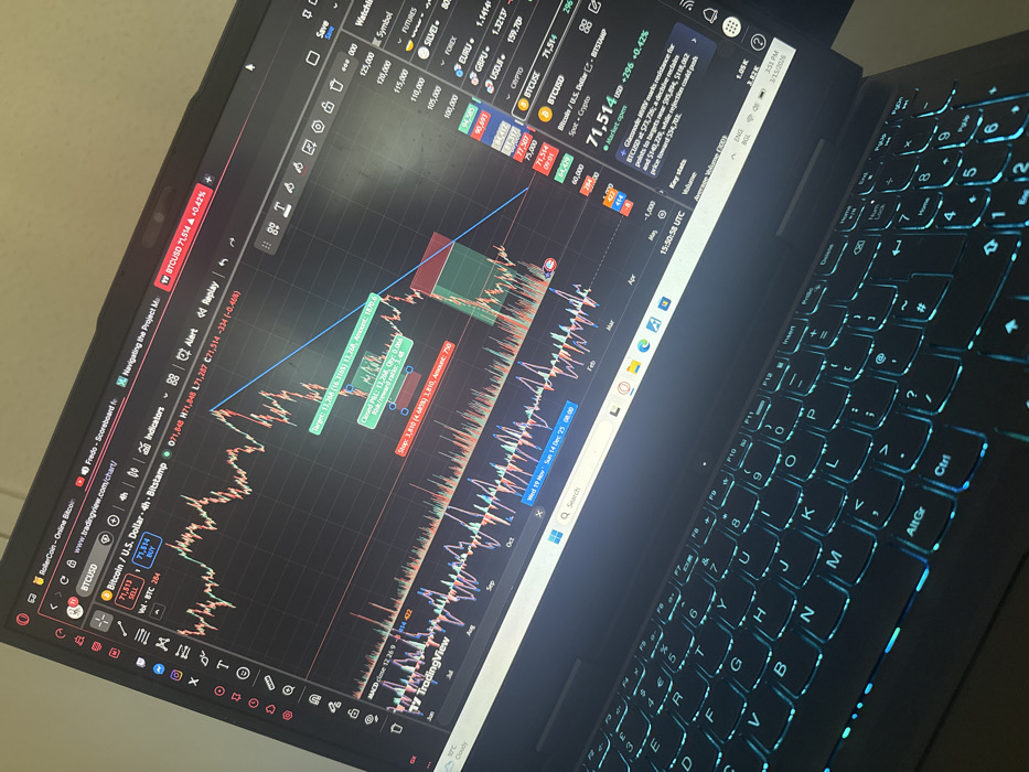 A black laptop computer is displayed open, resting on a flat, light-colored surface within an indoor environment in Welshpool, United Kingdom. The laptop's keyboard exhibits blue-cyan backlighting. The screen presents the TradingView website, showcasing a 4-hour candlestick chart for BTCUSD (Bitcoin/U.S. Dollar), with a current price of 71,514 USD reflecting a +0.42% change. Technical analysis elements overlay the chart, including a blue diagonal trendline, green rectangular 'Target' boxes, a red rectangular 'Stop' box indicating a potential loss of 750 units, and a green 'Closed P&L' box. Below the main chart, a MACD indicator is visible. Browser tabs titled "RollerCoin - Online Bitcoin" and "Fredo - Scoreboard fo" are visible at the top of the browser window. A watchlist for various cryptocurrencies and related assets is displayed on the right side of the screen. The Windows taskbar is partially visible at the bottom of the screen, indicating a search bar, weather information (10°C, Cloudy), and the date 3/15/2026. The immediate background behind the laptop screen is a plain, light-colored wall. No individuals are depicted in the image.
