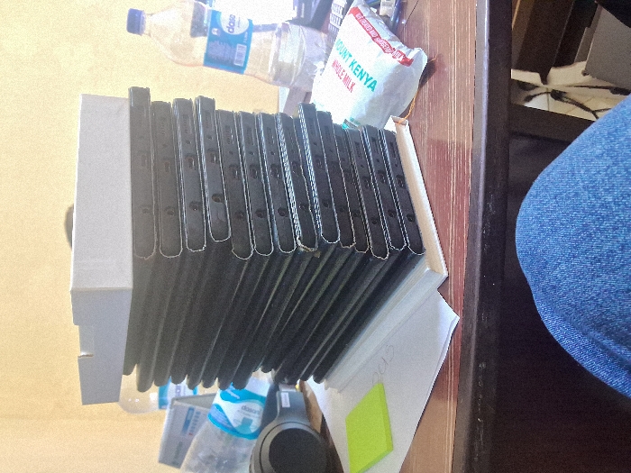 The scene is an indoor environment on a brown wooden table surface in Karingani ward, Kenya. A pair of blue denim-clad upper thighs are visible in the immediate foreground, indicating a seated individual. Centrally positioned on the table is a vertical stack of 14 black, rectangular electronic devices, each appearing to be in a protective case, resting on a white book. A white cardboard box is positioned on top of this stack. To the left of the stack, a black over-ear headphone, a crumpled clear plastic bottle, and a stack of green adhesive notes on a white paper marked "2015" are present. To the right, a partially filled clear plastic bottle labeled "daso" stands next to a white plastic bag marked "MOUNT KENYA WHOLE MILK." A small electronic device with visible buttons is partially obscured behind the milk bag. The background consists of a plain, light-colored wall.