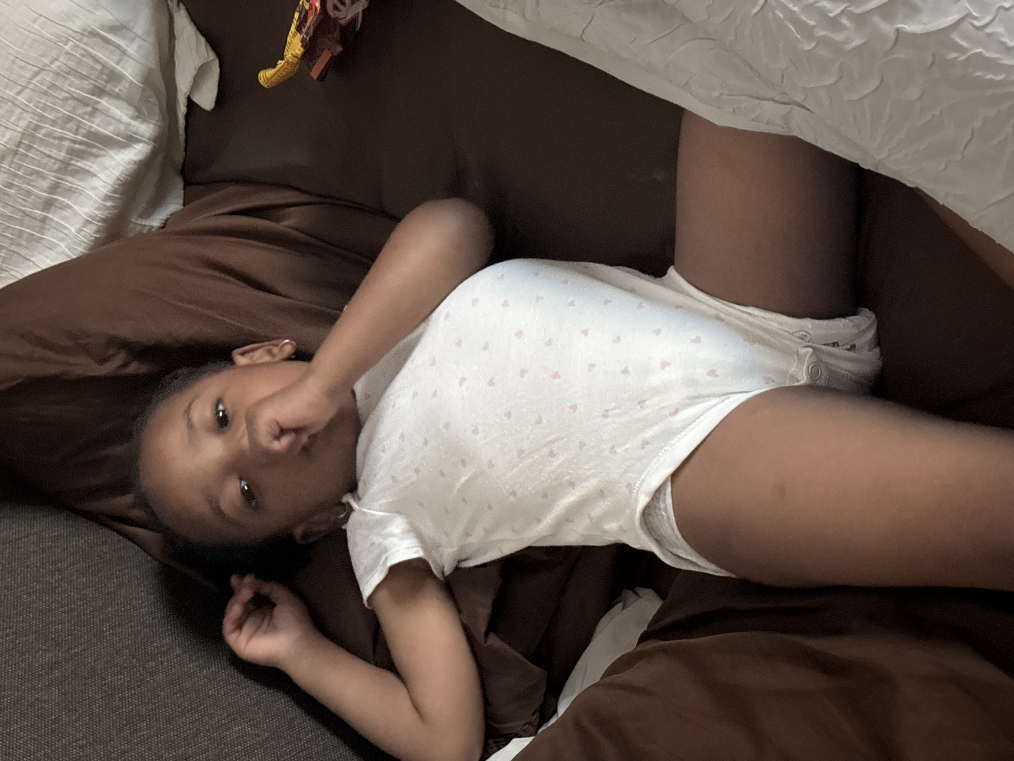A young child is depicted lying supine on a bed or sofa in Alaguntan, Nigeria. The child, with dark skin and short dark hair, wears a white short-sleeved bodysuit patterned with small pink hearts, over a visible diaper or white undergarment. A small gold-colored hoop earring is present in the child's right ear. The child's left arm is bent, resting on brown bedding material. Their right hand is positioned near the mouth, with fingers possibly inserted. The child's eyes are open and directed towards the viewer. The immediate environment includes a grey textured surface to the upper left, brown bedding material beneath the child, and a white textured blanket or pillow partially visible to the right. A yellow object, possibly a toy or packaged item, is partially visible on the brown surface in the upper right quadrant.