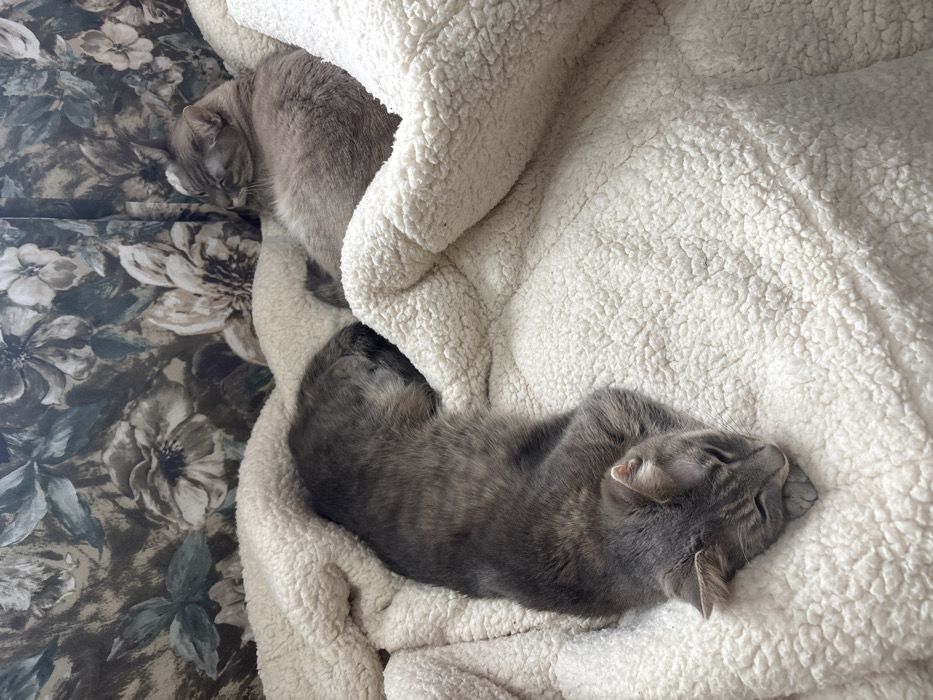 - "Two domestic cats are resting on a cream-colored, sherpa-textured blanket or pet bed, set against a dark, floral-patterned background, likely upholstery or a curtain" by FM-xLX8R2, licensed under CC BY 4.0
