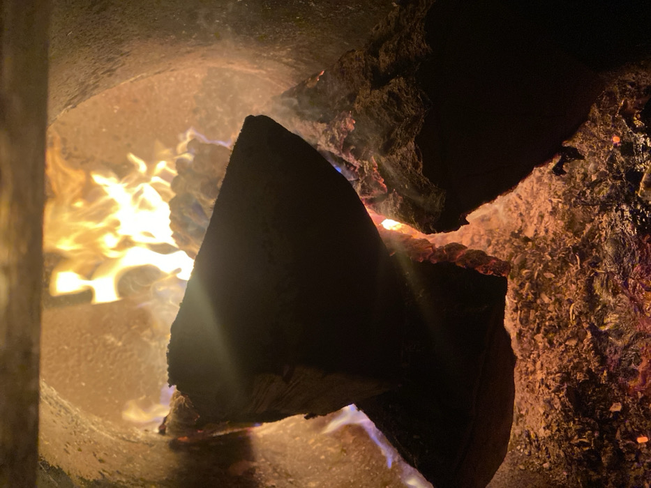 A dimly lit fireplace features logs arranged for burning. A triangular piece of wood occupies the foreground, its dark silhouette contrasting with the bright flames visible behind it. Smoke curls around the logs, hinting at the ongoing combustion process. The rough texture of the fireplace interior is evident, adding to the rustic ambiance. The glowing embers provide warmth and light, casting an orange hue on the surrounding surfaces.