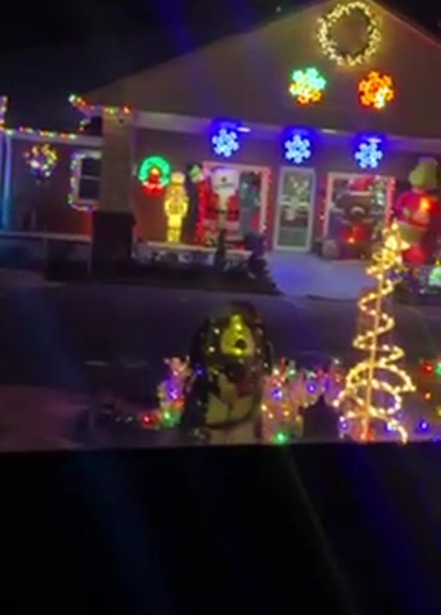building at night, festooned with Christmas decorations. The building is a single-story structure, and decorations include wreaths, snowflakes, a spiral Christmas tree, and various inflatable Christmas characters such as Santa Claus and the Grinch. The decorations are lit with colorful lights. The video is taken from a moving vehicle.