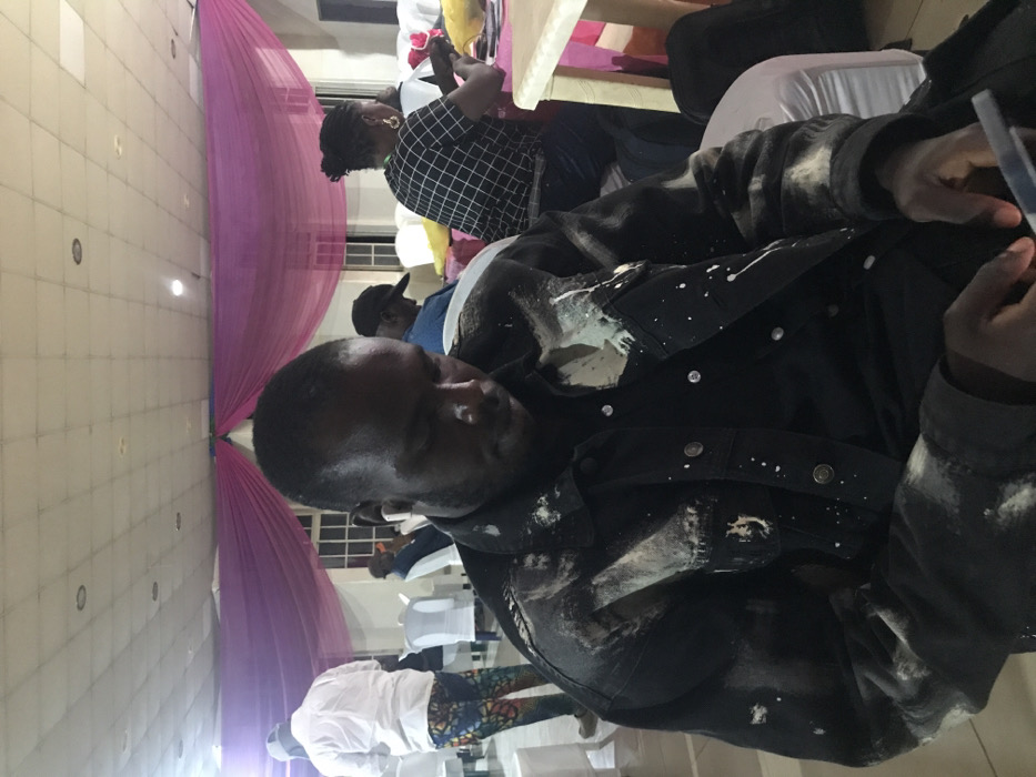 An indoor gathering has a man in the foreground, wearing a paint-splattered black jacket. He is possibly using a handheld device. A woman in a checkered top is seated in the background, seemingly using a phone. Other people are scattered around, including a man in a baseball cap and another wearing a white shirt and patterned trousers. Pink and white fabric drapes decorate the background, and rows of white chairs suggest the venue might be set up for an event.