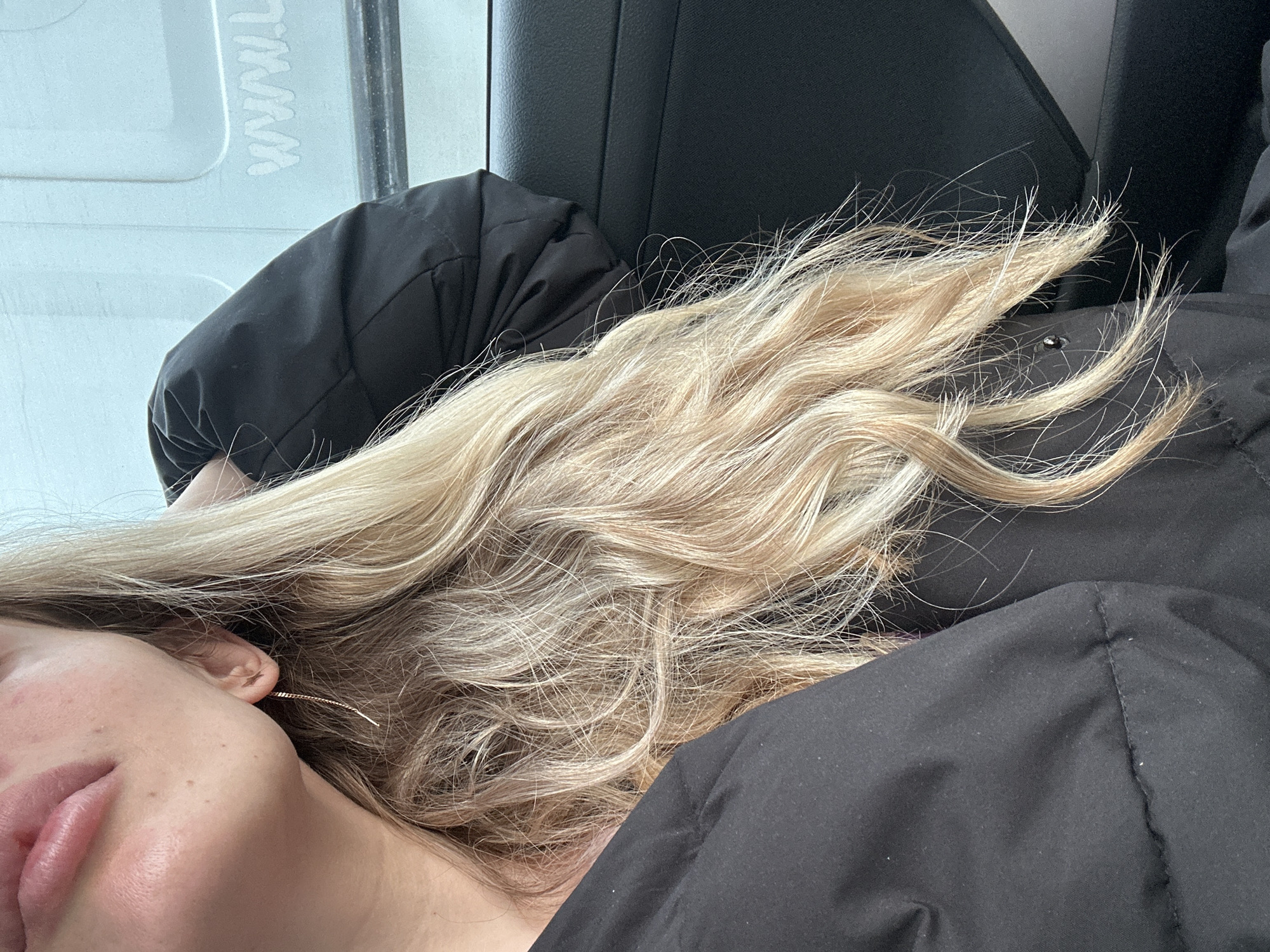 The scene is situated inside a vehicle in Kamianske, Ukraine. The image captures a close-up, angled view of a female subject, partially visible from the lower lip and chin down to the chest and shoulder area on the right side of her body. Her lips are light pink and appear full. Her skin is fair, with minor blemishes or freckles visible on the cheek. Long, wavy, light blonde hair with lighter highlights cascades over her right shoulder and chest. A thin, gold-colored threader earring is present in her right earlobe. The subject is wearing a black, possibly padded or quilted, jacket. Her right arm, covered by the jacket sleeve, is positioned upwards and back, suggesting her head is resting against an unseen surface or her arm. The interior of the vehicle is dark, likely black, with a textured plastic door panel visible to the right of the subject. Through the vehicle's window, a light blue or white surface is visible with a partial, reversed white text "WWW.L" or "7'MM". The external lighting is bright and diffuse.