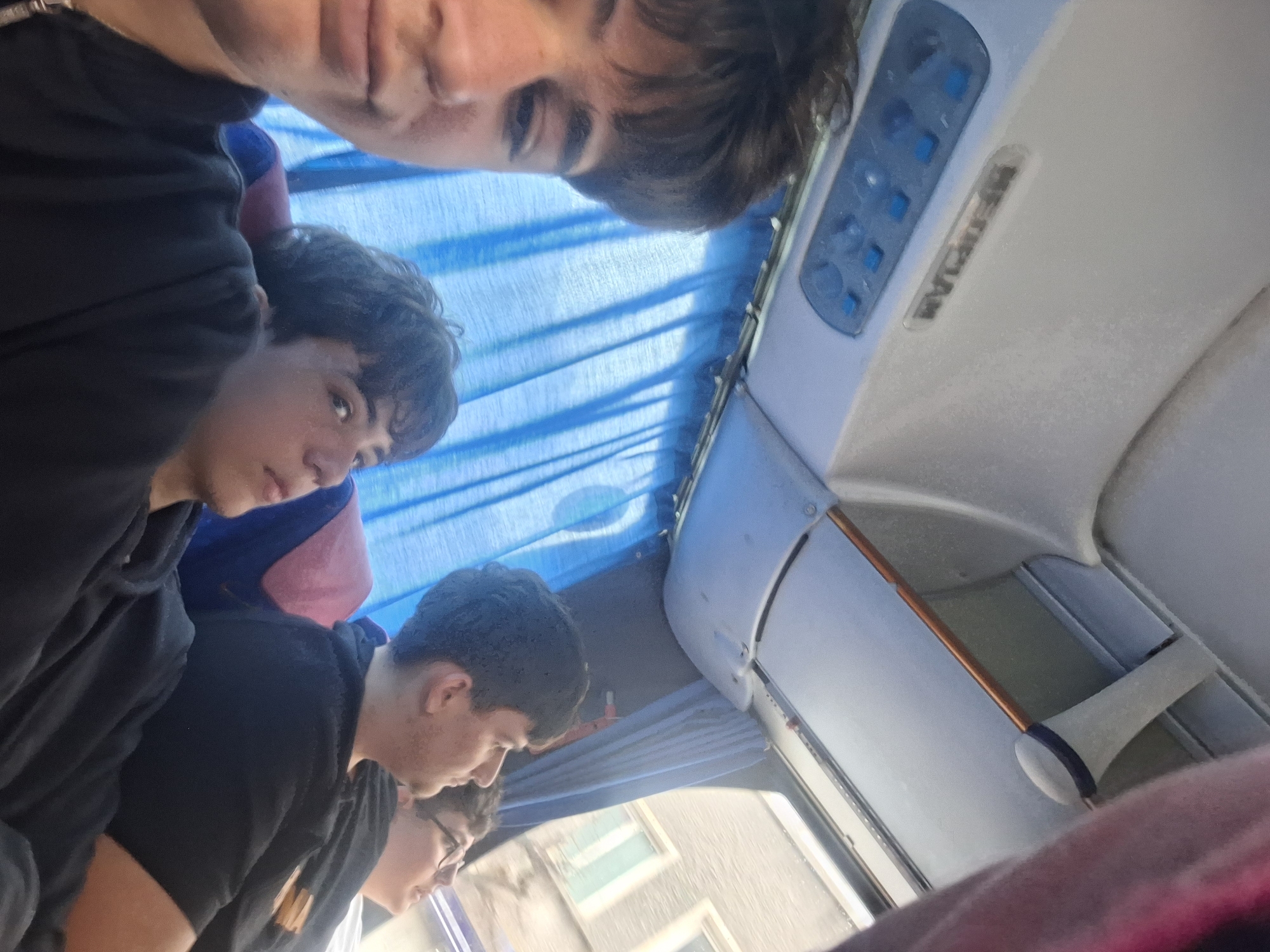 The image captures the interior of a passenger coach or bus, situated in the city of Asenovgrad, Bulgaria. Four male individuals, appearing to be adolescents or young adults, are seated in a row on the right side of the vehicle during daylight hours. In the immediate foreground, a person with dark hair is visible from the chest up, looking directly towards the camera. They are wearing a dark, zippered hooded garment. Seated behind and to the right of the foreground subject is another individual with dark, curly hair, looking towards the right with a neutral expression. Further back, a third person with dark, short hair and a light beard is seen looking upwards and to the right. Partially visible behind them is a fourth individual with dark hair and glasses, also looking upwards and to the right. The vehicle's interior includes a light-colored overhead panel that features a control unit with multiple blue buttons and an illuminated 'MERIDIAN' label. Below the overhead panel, a thin, copper-colored handrail is present. The windows are covered by blue, pleated curtains. Through the window on the right, the exterior of a grey-toned urban building with rectangular windows is visible, indicating an outdoor, city environment.
