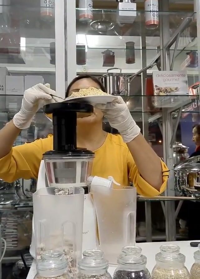 A woman wearing white gloves and a yellow blouse stands behind a white counter in a store, feeding oats into a black and white juicer. She is holding a white plate filled with oats in her left hand and uses a spoon in her right hand to scoop and feed the oats. The juicer has a clear container for the juice on the right and a clear container for the pulp on the left. There are six glass jars filled with different types of seeds and beans lined up on the counter in front of the juicer. Behind her is a glass display case filled with cookware, including pots, pans, and canisters. The lighting in the store is bright. Another person can be seen walking behind her in the background.