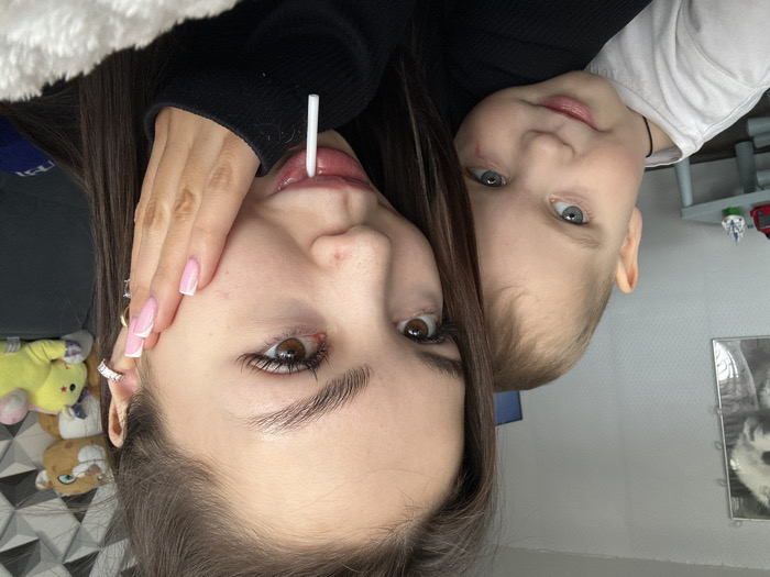 An image taken in a residential interior in the city of Chaikovsky, Russia, features a young woman and a young child in a close-up, chest-up portrait