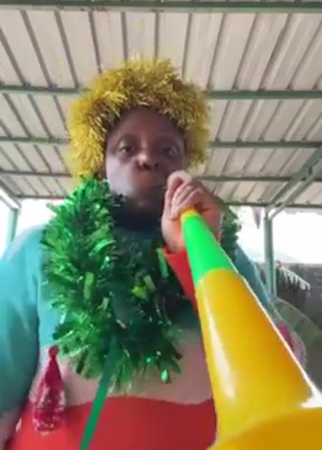 A woman is standing in front of the camera, wearing a multi-colored striped sweater, a green garland, and a gold tinsel wig. She is blowing into a yellow and green vuvuzela. The setting appears to be under an open-sided shelter with a corrugated metal roof. The woman is facing the camera directly.