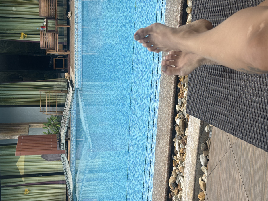This image depicts an outdoor leisure scene in Ban Tha Muang, Thailand. In the foreground, a person's bare legs and feet, with light-colored toenail polish, are crossed at the ankles and rest on a dark brown woven synthetic lounge chair. The skin on the legs exhibits lighter patches and a faint tattoo is visible on the left calf. To the left of the lounge chair, wooden deck tiles are visible. Immediately in front of the person, a border of various natural river rocks separates the lounge area from the edge of a swimming pool. The midground features a clear, rectangular swimming pool with bright blue mosaic tiles, reflecting the sky and surrounding structures. A dark blue tiled line marks the waterline. In the background, beyond the pool, a building is visible with multiple large glass sliding doors covered by light green curtains. To the left, a light-colored, net-like hammock structure is positioned partially over the pool from a wooden base. A tall, brown slatted wooden screen or divider stands near the center of the background, with a small green plant behind it. To the right, two wooden slatted benches flank a small wooden side table holding a red can and another object. A pair of light-colored sandals rest on the wooden deck near the right bench. Further right, a wooden rack or drying stand is present. The overall environment suggests a resort or hotel setting.