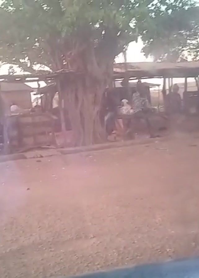 The video depicts a somewhat indistinct view of a rural or semi-rural scene. In the foreground is a dusty, reddish-brown ground surface. Behind this, several makeshift wooden structures are visible, resembling small market stalls or sheds. Under a large tree, there are people sitting. Some are wearing head coverings. The video quality is slightly grainy. The scene appears to be outdoors, possibly in a village or small town setting.