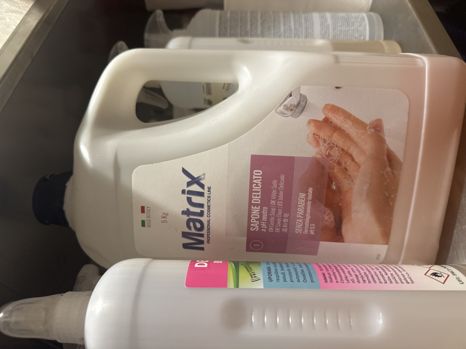 This image depicts a collection of commercial cleaning and cosmetic products stored on a light-colored shelf within a location in Radovljica, Slovenia. The central and most prominent object is a large white 5 kg plastic jug with a handle and a black screw-on cap, labeled "Matrix PROFESSIONAL COSMETICS LINE." Its main label, partially pink-purple, identifies the product as "SAPONE DELICATO a pH neutro" (Gentle Soap, pH 5.5, dermatologically tested, paraben-free), with translations including English, German, French, and Spanish. The label also features an illustration of hands with soap bubbles and indicates "MADE IN ITALY." The liquid inside the jug appears light pink. To the left, a tall, slender white plastic bottle with a white spray nozzle is partially visible. Its label, featuring pink and green sections, displays Slovenian text regarding usage ("UPORABA"), the product name "DEO," a UFI code ("PXCX-P0M9"), and a flame hazard symbol. To the right of the central jug, another white plastic container with a white spray nozzle is partially visible, followed by a clear plastic bottle containing a pale yellow liquid. Further right, rolls of white paper or towels are visible. A dark surface, likely another shelf or wall, is situated above and behind the items.