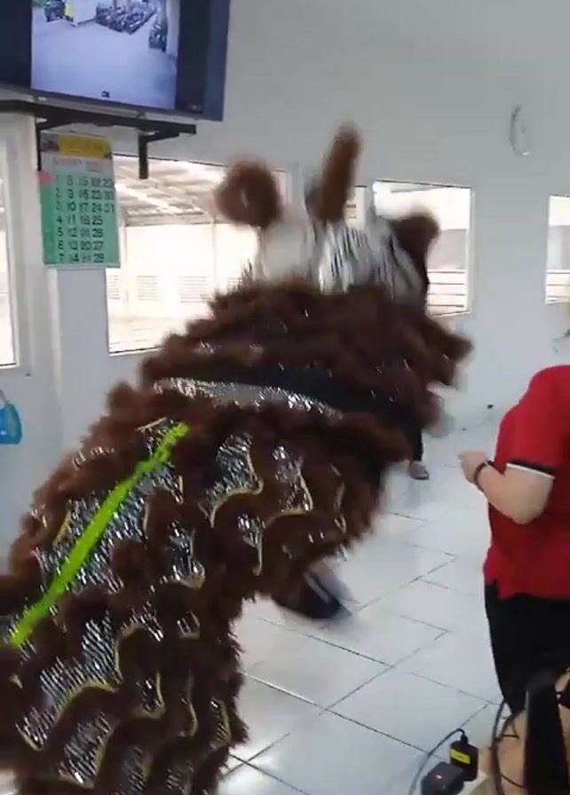 The scene is indoors, in a well-lit room with white tiled floors and white walls. A brown lion dance costume, adorned with shimmering decorations, is in the foreground. People stand around watching, including a woman in a red shirt near the right edge of the frame, and a family of three visible through a window. A security camera feed plays on a wall-mounted television. To the left of the TV is a calendar for March 2024. The lion dance costume is being manipulated, though the performers inside are not visible.