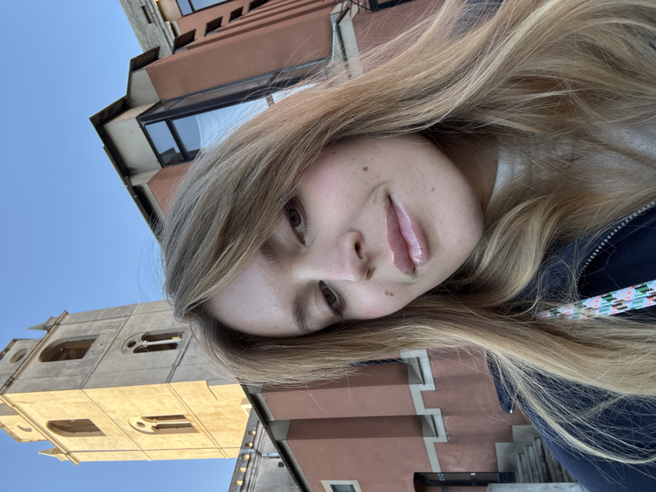 A young woman with long blonde hair poses for a selfie outdoors. Buildings stand in the background, including a tower with arched openings. The sky is visible. She wears a dark blue jacket, and her lips appear glossy. Freckles are visible on her face. The image is slightly rotated, giving a tilted perspective of the scene.