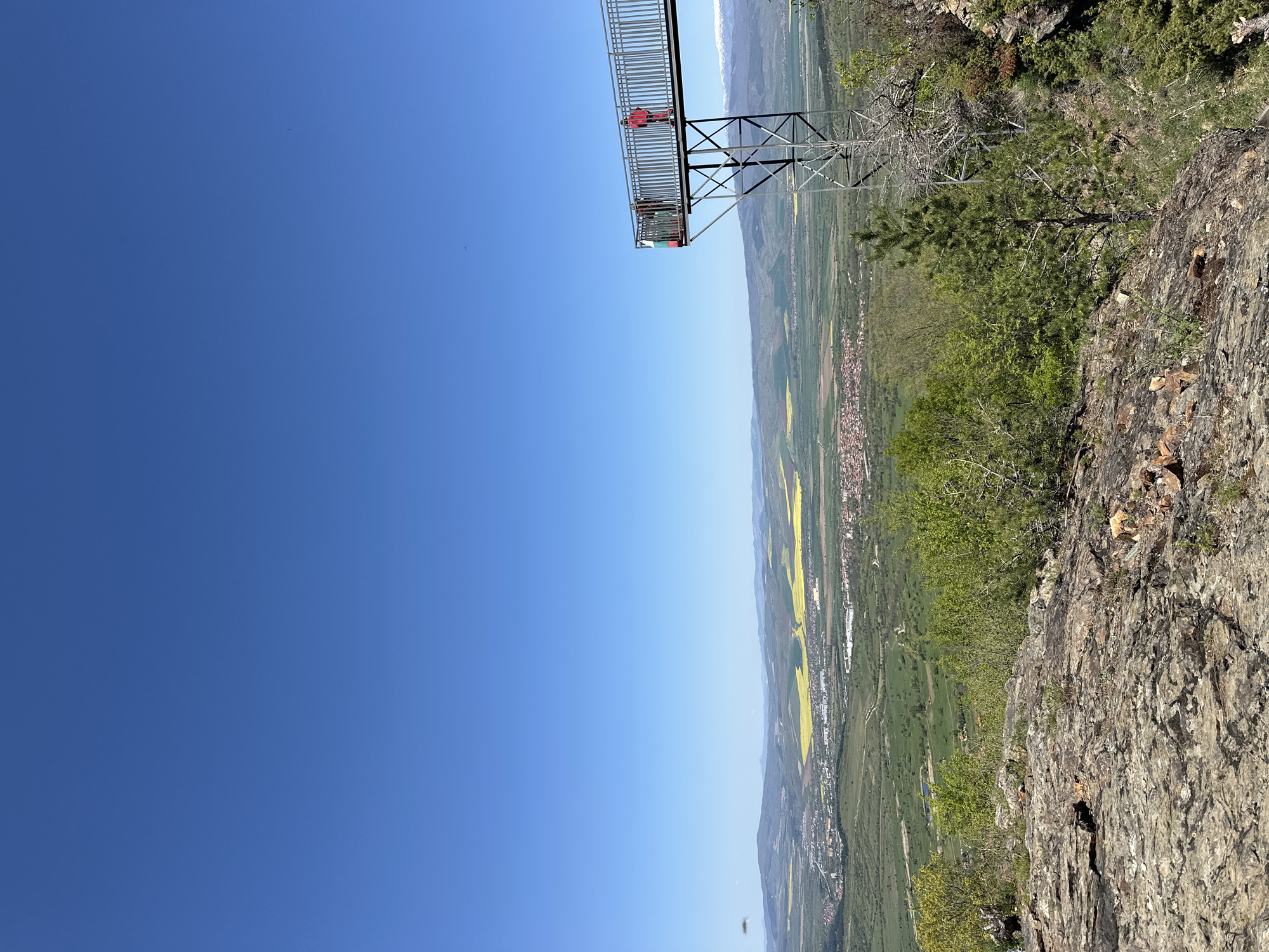 The image depicts a scene from the Kaliakra Viewpoint in Bistritsa, Bulgaria. A viewing platform extends from a rocky cliff, with several people visible on the platform. The landscape below consists of a green valley with patches of yellow fields and a city in the distance. The sky is clear and blue. The foreground features rocky terrain and vegetation.