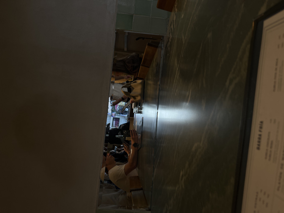 A view down a narrow passageway, seemingly within a restaurant. A man is visible taking a picture with his phone. A marble-like countertop runs along the right side, with a menu displayed. Beyond the man, there's a partial view into another space filled with people and various objects. Tiles can be seen at the top of the passageway. The lighting appears dim, creating a mysterious ambiance.