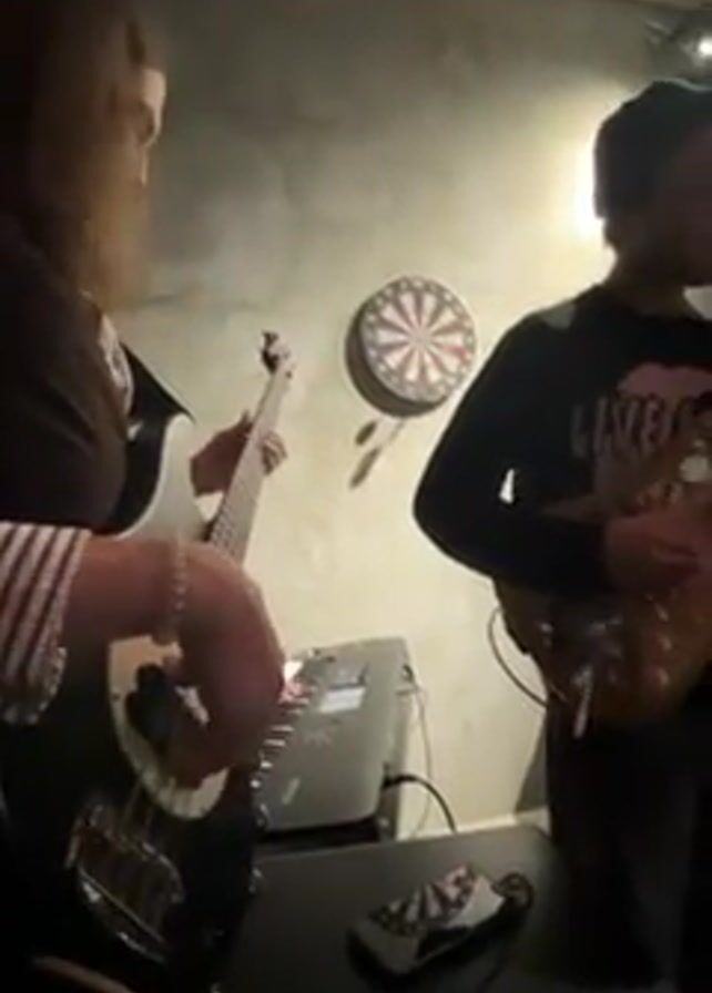 Two musicians are visible in this indoor scene. The musician on the left plays a black bass guitar. They have long hair and wear a vest over a striped shirt. The musician on the right plays a gold-colored electric guitar and wears a black beanie and black sweatshirt that reads "LIVE". To the left and slightly behind the musicians is a piece of music equipment. Behind the musicians on the wall, is a dartboard with darts in it. The ceiling is visible. In the background behind the guitarist, there is a drum set. The camera pans slightly to follow the guitarist. The musicians are playing music.